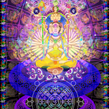 Om Mani Padme Hung echoes outward and forms a border for the journey into this piece. Sitting atop an all seeing unfolding cosmic lotus, the bodhisattva rendition of myself finds true harmony in the universe, confluencing with the cosmos. Manifesting thigles offering knowledge of Rigpa and Breath, while holding staffs of destruction and creation. The hands unfolding extend various objects of auspiciousness as well as tools of my trade. I meditate under a celestial chatra with 3 monk's bowls to my front, and in the foremost bowl an illuminated jewel of the dharmachakra shines through as the solitary offering. There exists a balance between the light on the top and the darkness on the bottom, representing equanimity. The mani at the center illuminates a flower of life energy source. An additional rainbow orb envelopes me, and the luminescence of the chakras shine brighter aligned in the center. The third eyes are open on each of my multiple heads, to allow additional metaphysical input for the eyes and ears of compassion. A third vajra can be seen enlightening the energy behind the top cranial stack, and a smiling green head and an upset red head can also be seen on the cumulation below. The background energy was inspired by the shrine on Mount Putuo. ☸☸ Bodhisattva - Avalokiteskarl ☸ I am devotion of compassion to save the suffering sentient beings For in the potential existence of life there must be cosmic anguish ☸ I must take a step out of myself to understand I am everything that is ever was and ever will be billions of years of affliction cycling samsaric states of incarnation ☸ Thus I follow the cosmic order of law, truth and balance perpetually performing dharma For it is our desires that causes our suffering to yearn for things out of our control constant distractions from core issues ignoring the seeds growing from unknown ☸ Yet if you look within yourself and you follow the voice that isn't inside your head a voice that comes from beyond within look deeper than what one defines as self and heed the emerging wisdom discovered ☸☸ Where is my ground? Where is my center? That primordial state that amoebic realm A space that knows no space no time no place to be with borderline existlessness and a glimpse of the source the singularity of being wholesomeness with the cosmos Where is my space? Where is my rainbow body? ☸☸